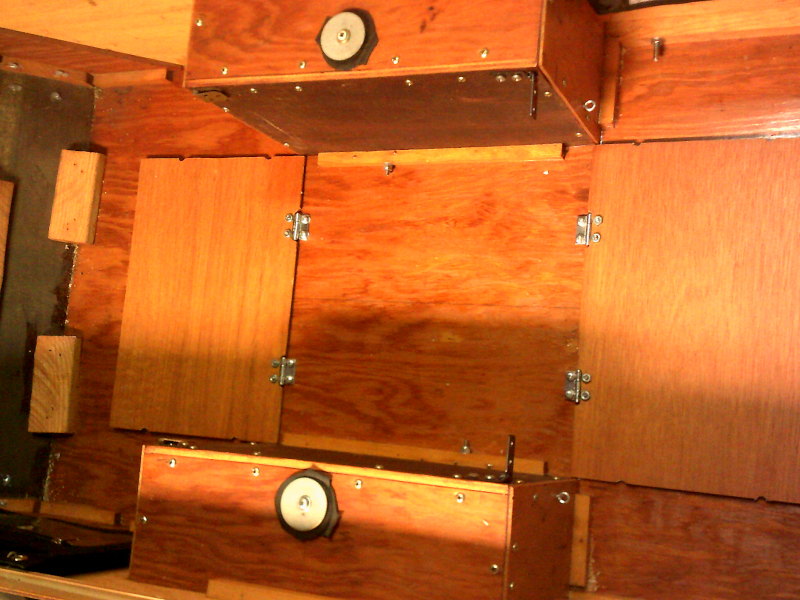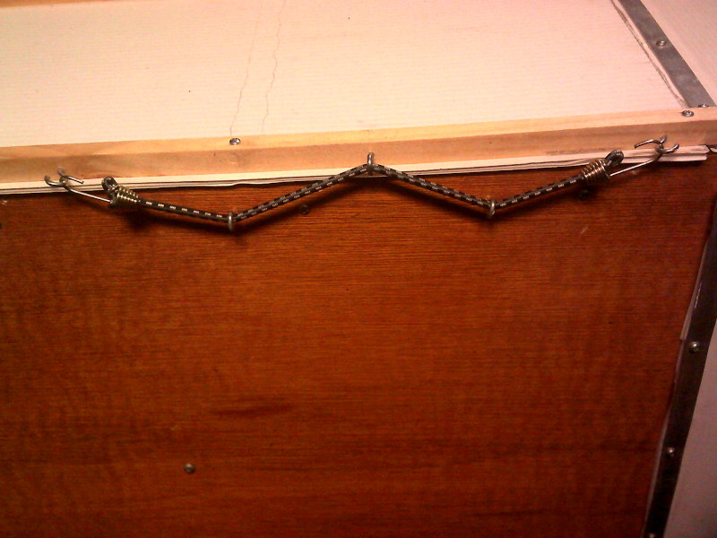 similar wood strips running down the inside tops of the side walls. On the top, three such pieces run down the length, partly to keep
