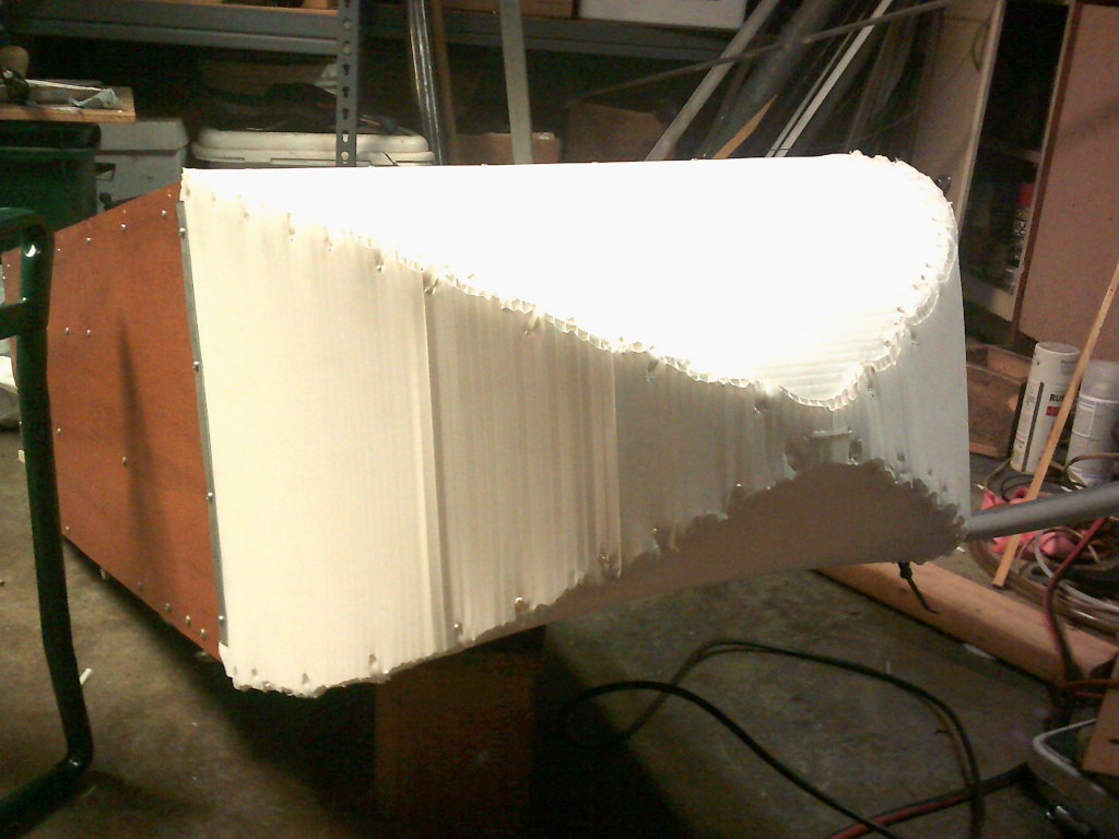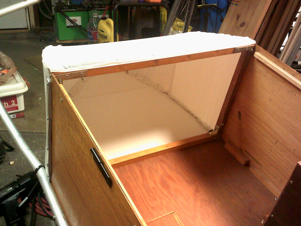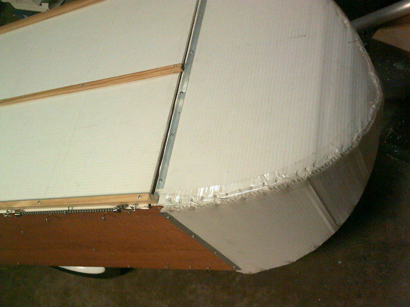 Unfortunately I creased the Coroplast in a couple of places. It'll have to do. Since the nose doesn't have a flat floor, I might decide to put a removable shelf inside there. (The aluminum tube used for the tongue shown in the picture was a smaller-diameter one, before the final 1.2" one which finally proved to be adequately stiff.)