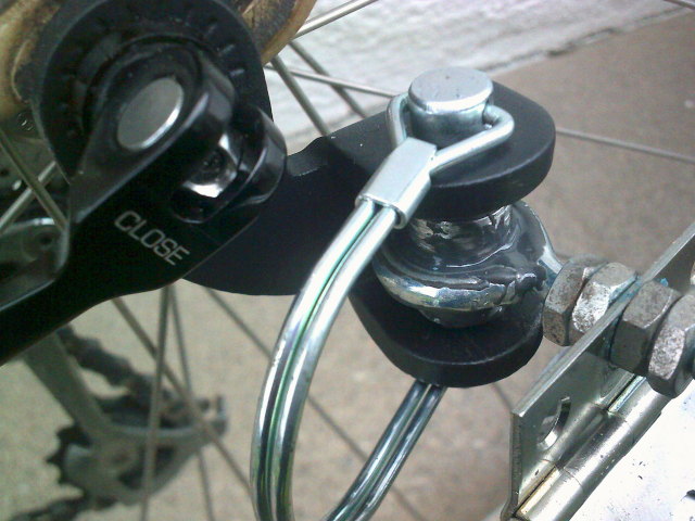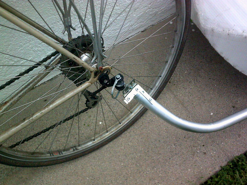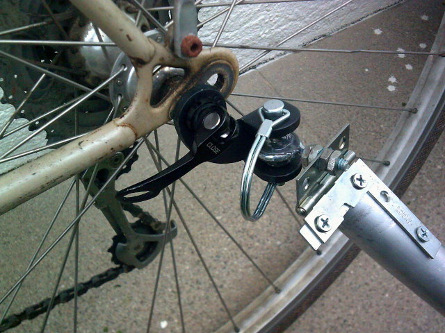 This is the gizmo I bought on eBay to clamp to the bike's left-rear dropout with the skewer, to hitch to: