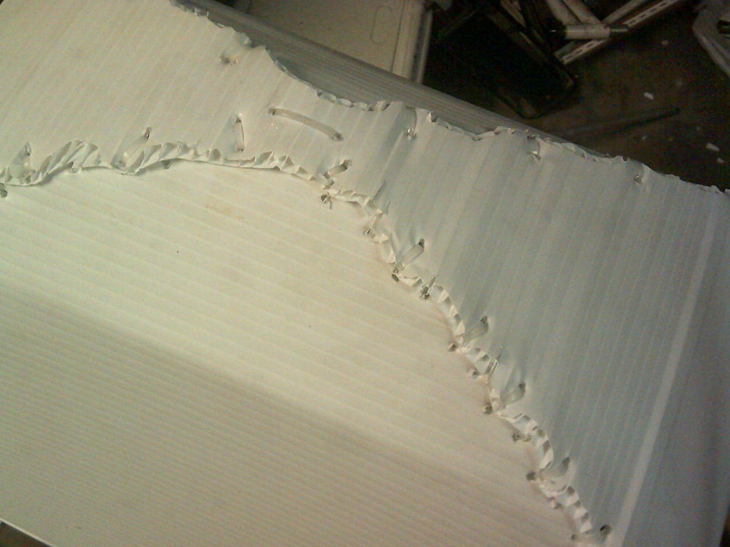 thick aluminum wire, made loops in it to screw down to the wood, and then put Coroplast over it, and tied it to the wire with lots of zip