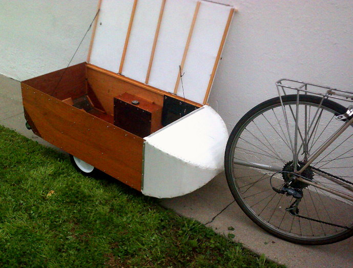Features: The trailer has 5½ cubic feet of internal space, and more stuff could be strapped on top if necessary, like on a roof rack of a car. (Or, you can just remove the top in a jiffy.) It has 10" solid-rubber tires, and has springs to avoid damage from hitting bumps hard. It's designed to be aerodynamic. The bottom is more or less waterproof, so if we had to go through several inches of water, it'd float like a boat. Although the wheels and suspension parts would get submerged, the insides should stay dry. The top is water-resistant for light rain; but if I really needed it waterproof, I'd have to tape around the cover, or make a large, removable thing with an elastic band, like a ladies' shower cap. The empty weight is 25 pounds, two pounds less than the bike it's shown hitched up to.
