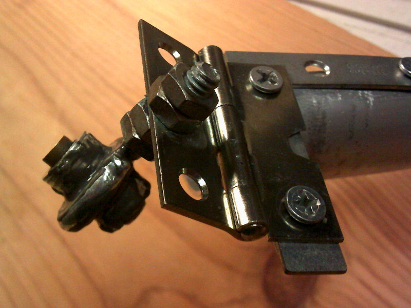 Many of the trailer parts are assembled with blue LocTite on the threads so things cannot loosen on their own. The thing with the four nuts on it is a screw eye, with an aluminum spacer pressed into it (I had to put the spacer on a bolt, in the drill, to file it down to size), and a piece of brass tubing inside of that, to take up the slop on the pin of the part that's on the bike, shown below. The goop is JB Weld. Each pair of nuts shown above is tightened against each other, with no pressure on the hinge, so the screw eye can rotate in the hole I drilled in the middle of the hinge. So there you have the three axes of rotation.