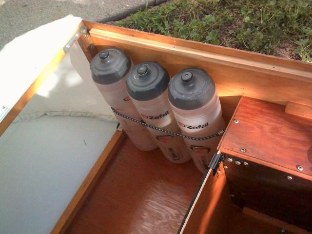 On the other side, a small bungee cord (described above) can hold three tall (32oz) cycling water bottles: