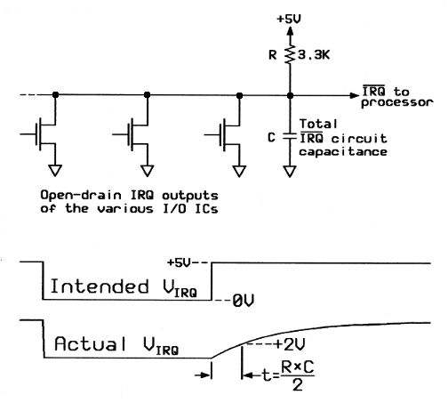 To remedy this, WDC's W65C22S's (note the "S" on the end) IRQ output is not open-drain, but a standard totem-pole output. This makes the rising edge much faster, which becomes important at the higher clock speeds. The down side to having the totem-pole IRQ outputs on WDC's W65C22S is that you need an AND-gate arrangement to connect two or more IRQ sources to the 6502's single IRQ input.