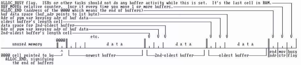 Here's a poor screenshot of a text diagram in the DOS/ANSI (code page 437) characters, showing the arrangement of bytes. The diagram shows three buffers allocated; but you can have any number you want as long as it all fits in 32KB. (It might work past that, but there's no reason to even check, especially since my current workbench computer only has 16KB of RAM.) Again, there's never any fragmentation with this method.