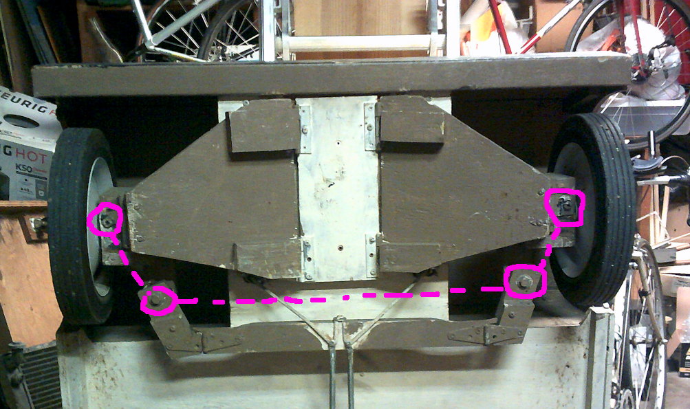 circle. The bright purple lines are drawn by hand, approximately the direction the axles point: